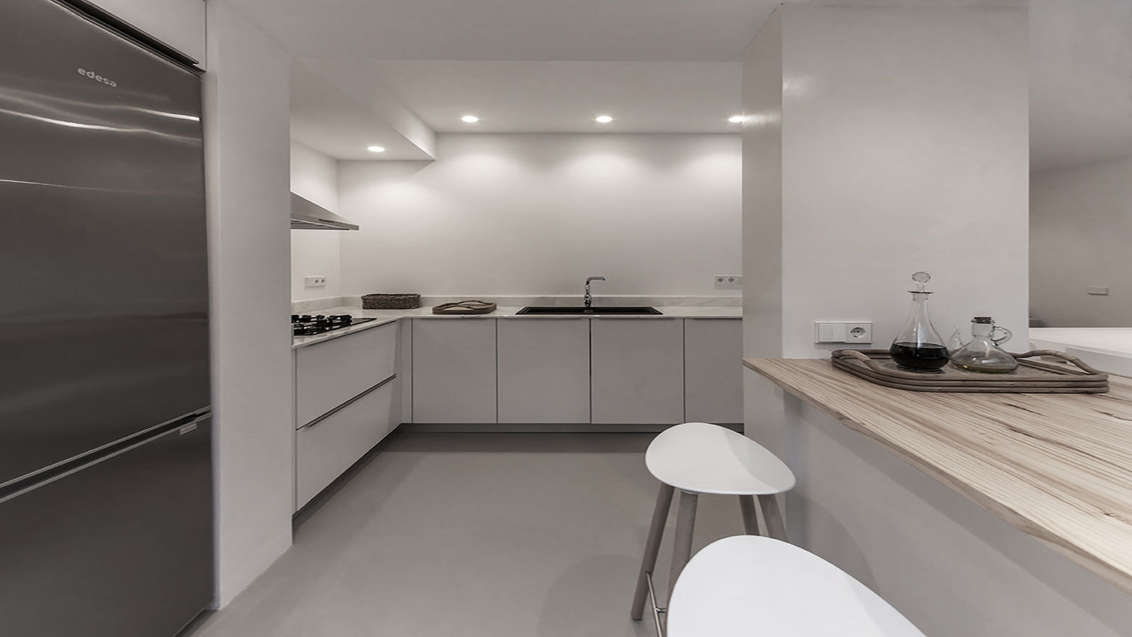 Cocina en blanco y madera abierta al salón. Este proyecto precisaba de una cocina sencilla, bien pensada y que conectara de manera sutil con el salón. La estética debía ser limpia, blanco y madera debían ser las notas que concedieran el carácter nórdico y modesto.