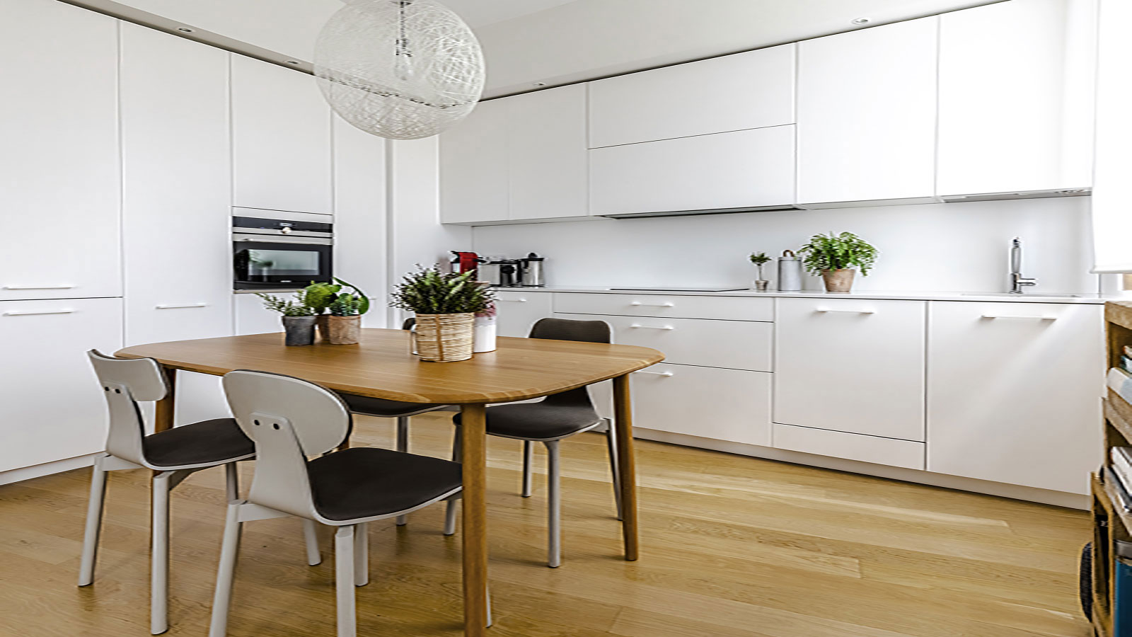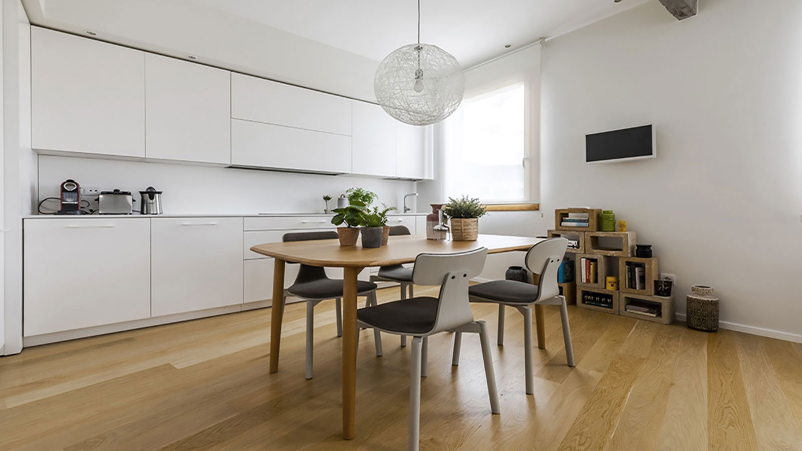 Amplio espacio en el que una cocina muy funcional se funde con el espacio dando protagonismo al resto de elementos que completan el interiorismo.